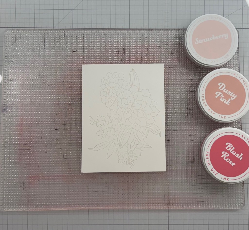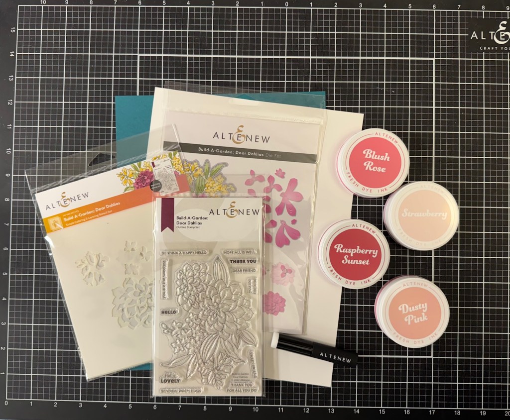 My inspiration for this project was the Dear Dahlias Build-a-Garden set from Altenew along with the Blushberry Bliss ink family, which is currently my favorite set of pinks.