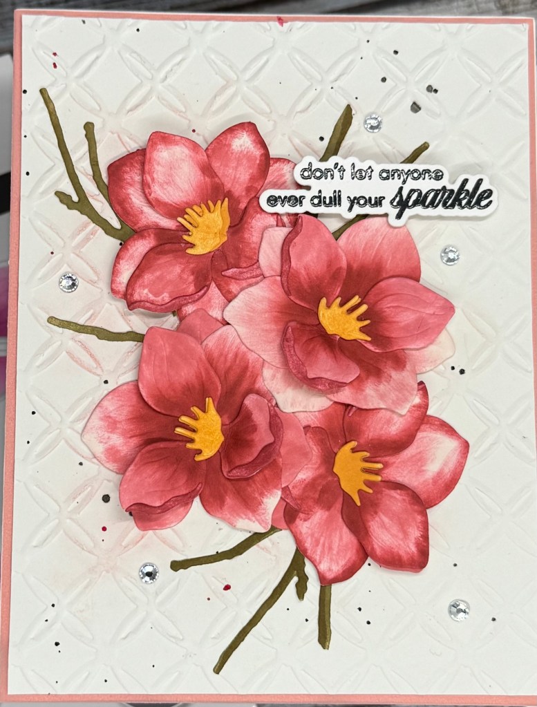 Then I layered the finished flowers and glued them together and layered them on an embossed background. I added a sweet sentiment from Altenew and some bling to finish the card.