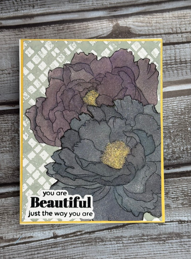 I made this card using the Billowing Peonies stamp set from Altenew. The stamps are big and bold and just beautiful. I used watercolor paint to color them in, and then followed up with a layer of metallic shimmer. I think I was a bit too heavy-handed with the shimmer to be honest.