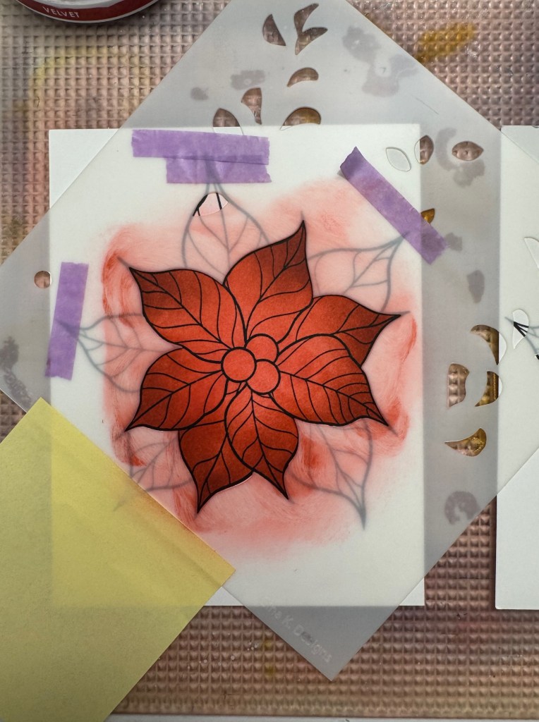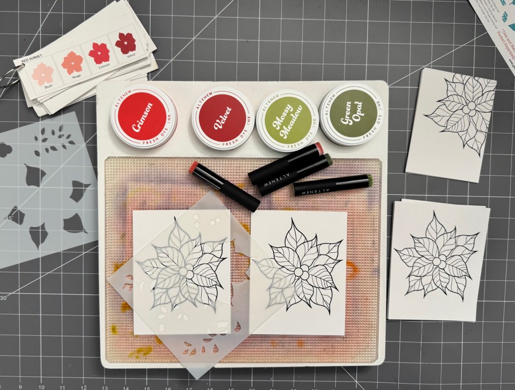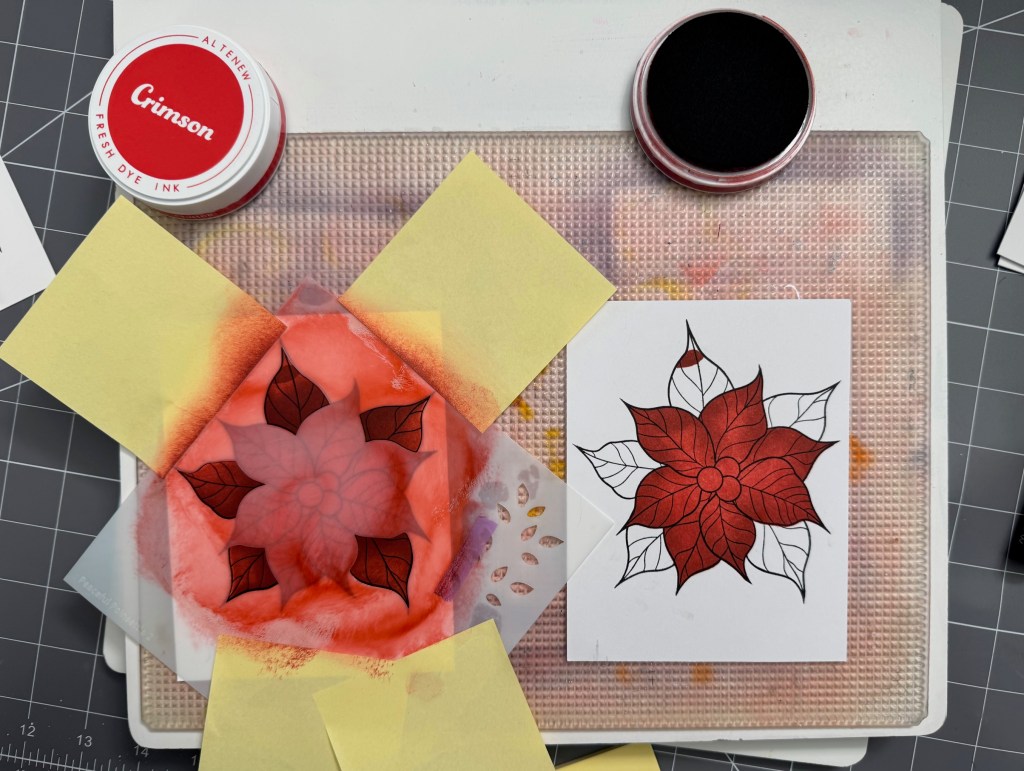 I started a new crafty “harvest” by using the Garden Method to create a batch of beautiful Poinsettias made from a GinaK stamp set. My set up to use stencils to color in batches is fairly simple. I have a handmade stencil station that uses a sticky mat and a rotating base, and I line up two stamped images at a time to stencil.