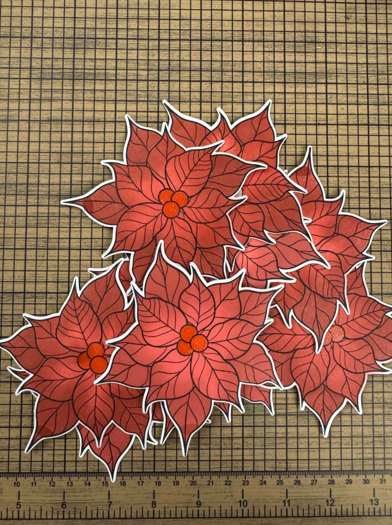 I repeated the process for my other pre-stamped images and ended up with a beautiful pile of poinsettas that are ready to be the focal point of Christmas cards!