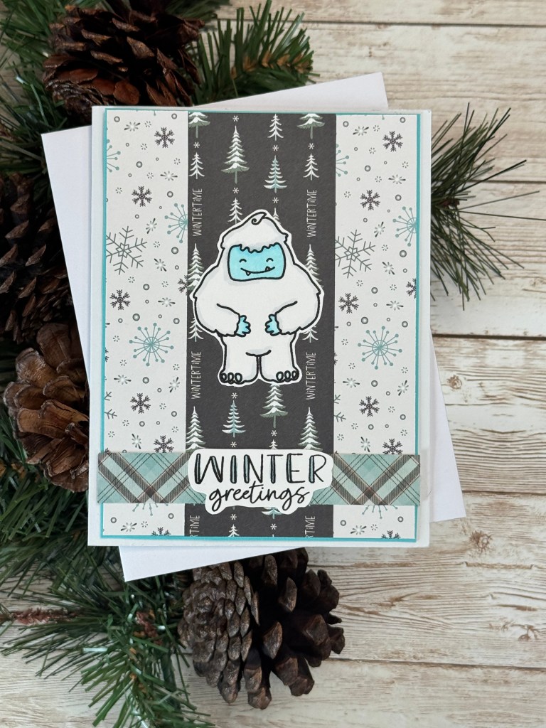 This card began with one very fluffy, very charming little yeti. I stamped him on white cardstock and colored him in soft aqua tones to give him that “fresh from the snowstorm” glow. His little turquoise hands and toes add just the right pop of personality, like he’s been out building frosty snowballs all morning.